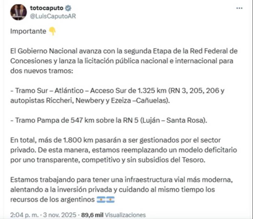 El anuncio fue realizado por el ministro de Economía, Luis Caputo, mediante su cuenta oficial de X en la que precisó que el Ejecutivo “lanza la licitación pública nacional e internacional para dos nuevos tramos”. Entre los mismos están las autopistas Riccheri, Newbery y Ezeiza-Cañuelas.