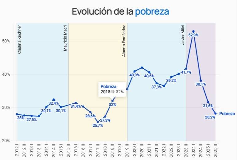 La pobreza llegó al 28,2% en el segundo semestre de 2025 en la Argentina, según publicó este martes el Instituto Nacional de Estadística y Censos (INDEC). Es el nivel más bajo en 7 años.